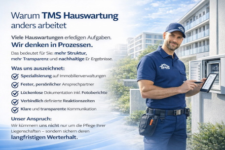 TMS Hauswartung unterstützt Immobilienverwaltungen bei der nachhaltigen Werterhaltung von Wohn- und Gewerbeobjekten.